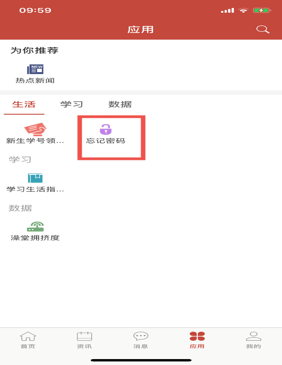②打开你好苏大手机app-应用,点击忘记密码,按照提示操作即可