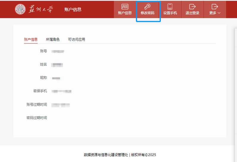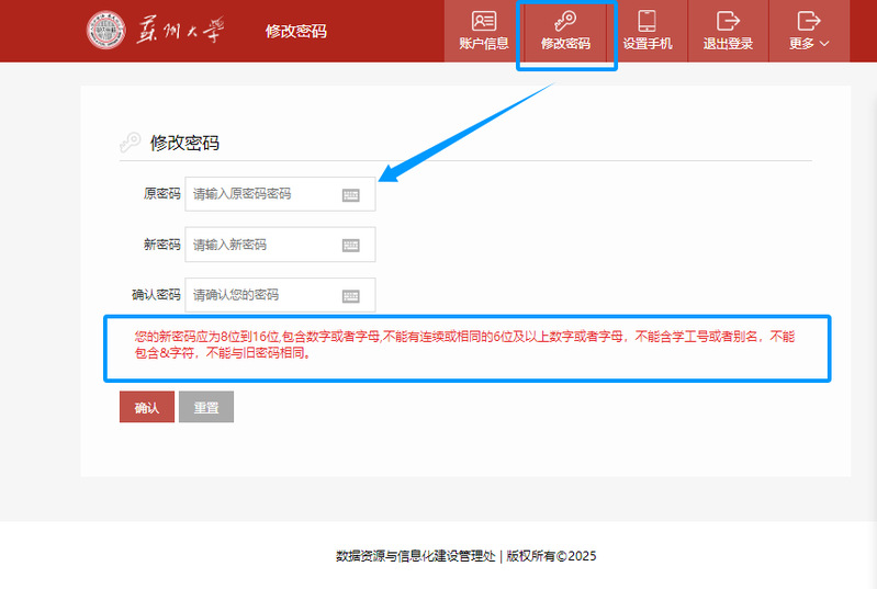 ① 访问https://auth.suda.edu.cn/sso/user#/,登录后,点击“修改密码”,按照提示操作即可。注意,修改的密码一定要符合页面要求的密码规则。