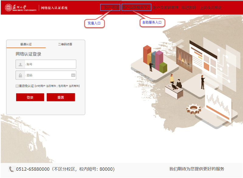 在“网关登录页面”上点击“用户自助服务平台”进入自助服务系统的登录页面,输入用户名和密码后进入系统。