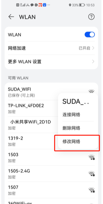 3、连接成功后,长按SUDA_WIFI信号名,选择“修改网络”设置。