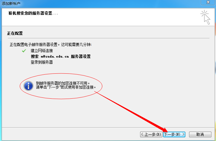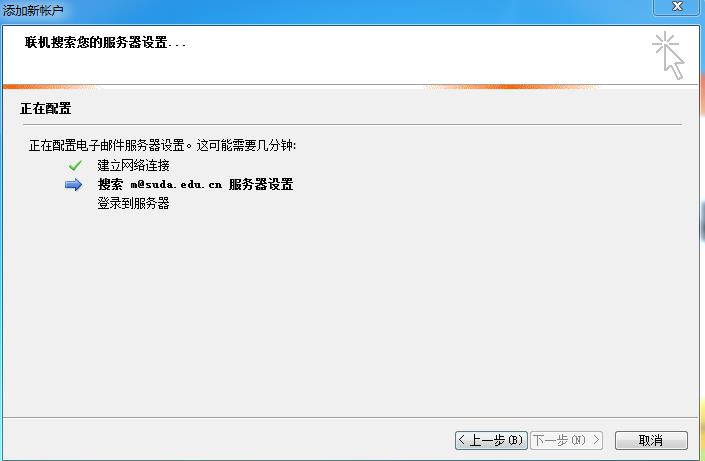 系统将自动搜索邮件服务器设置。根据系统提示进行。