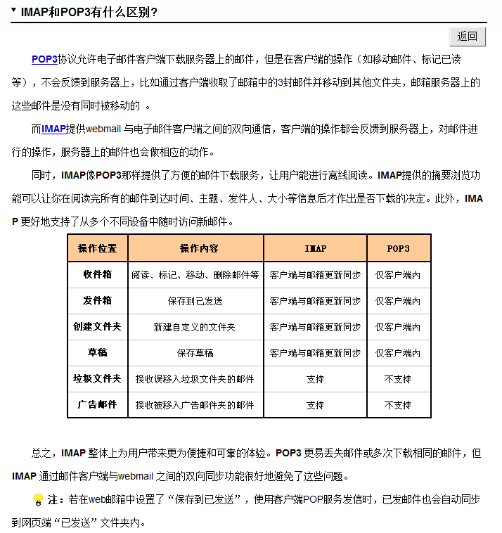 上面演示的是用IMAP协议来收取邮件,您也可以用POP3协议来收取邮件。IMAP和POP3的区别,详见附注。
