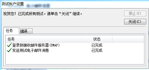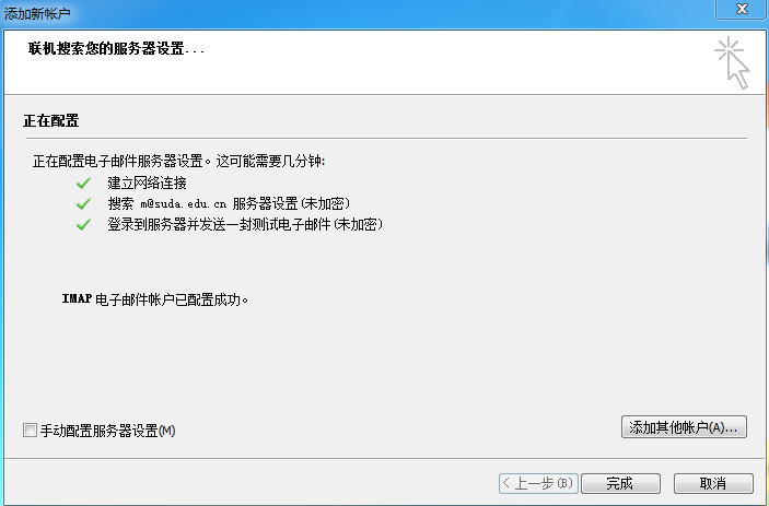 到了上图这一步,邮件帐户的配置已经完成,从上图可以看出,默认用的是IMAP协议。您可以点击“完成”,