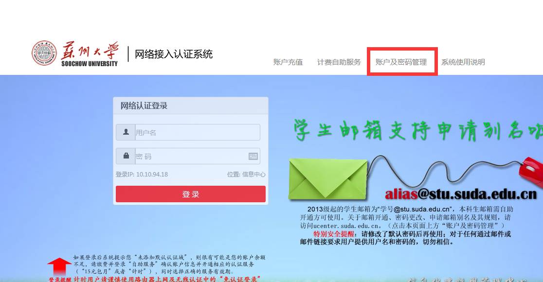 打开网关页面http://a.suda.edu.cn/,点击“账户及密码管理”