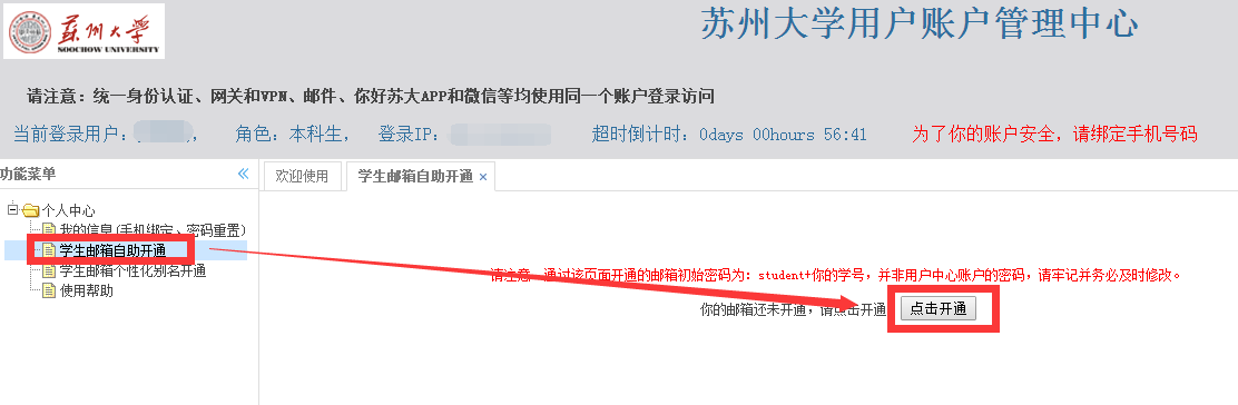 登录后,选择左边菜单的“学生邮箱自助开通”,即可开通