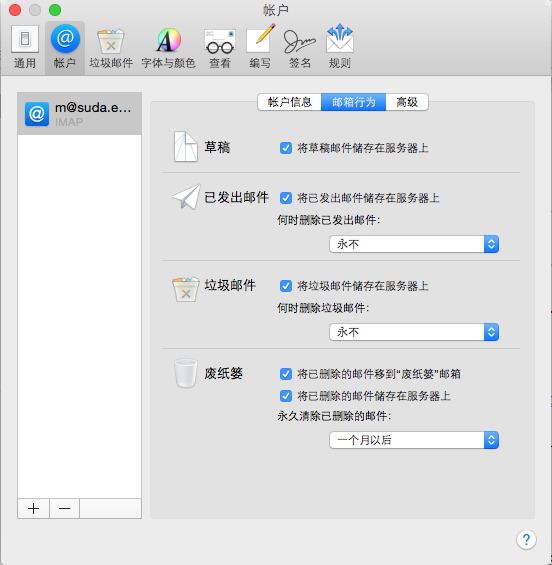 图12为邮箱行为的默认设置,这里一般不用改变,或者根据自己的需要改变。图13是一些其他高级设置,在这里需要注意的是IMAP的端口,请不要勾选“SSL”,使用默认端口143即可。