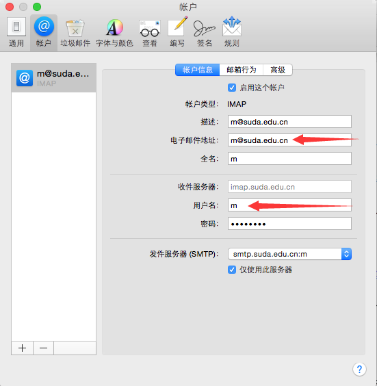 进入账户信息,如图10。需要注意的是,学生邮箱的后缀是“@stu.suda.edu.cn”,所以如果按上述步骤进行,登录可能会有问题,这时,请将图中的用户名输完整:学号@stu.suda.edu.cn。