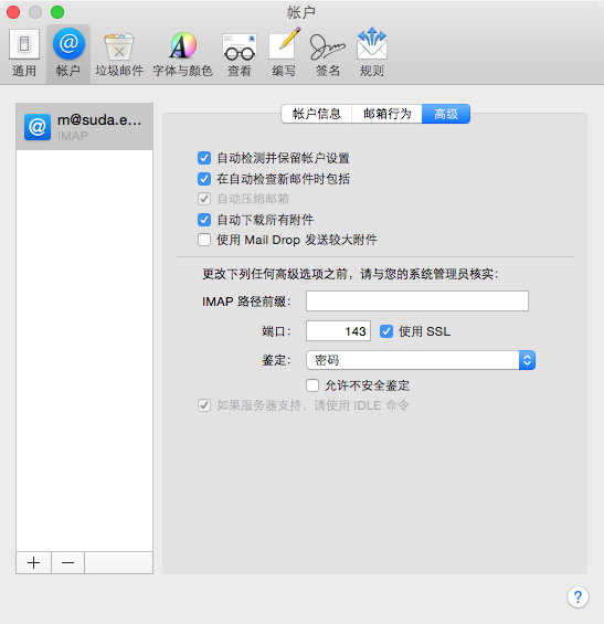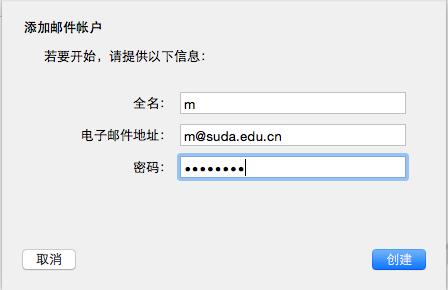 以下是MAC操作系统自带邮件客户端的苏大邮箱设置操作范例,MAC操作系统版本为10.10.2。以下操作供用户参考。