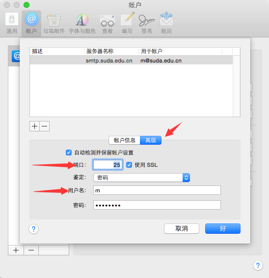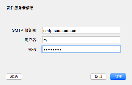 填写发件服务器信息,发件服务器地址为:smtp.suda.edu.cn。这里需要再次输入用户名和密码。见图7。