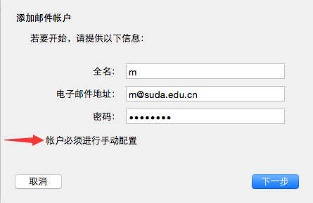 系统会自动判断服务器情况,可能会返回刚才的输入界面,并提示“账户必须进行手动配置”,点击“下一步”,见图4。
