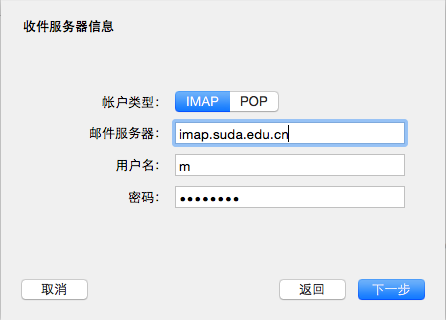 填写收件服务器信息,这里一般使用IMAP协议(账户类型),收件服务器为imap.suda.edu.cn,如果使用POP协议,相应的收件服务器地址为:pop3.suda.edu.cn。见图5。