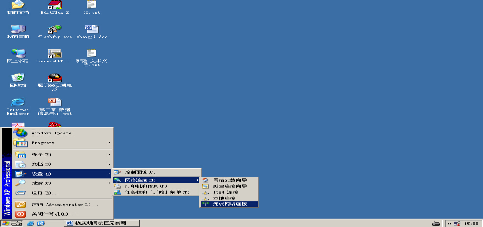 在计算机正确安装好无线驱动后,将在操作系统的右下角出现一个无线网络连接图标,未建立无线网络连接前,图标上会出现一个叉符号。为建立无线网络连接,用户可以点击“开始”“设置”“网络连接”“无线网络连接”,如下图所示;