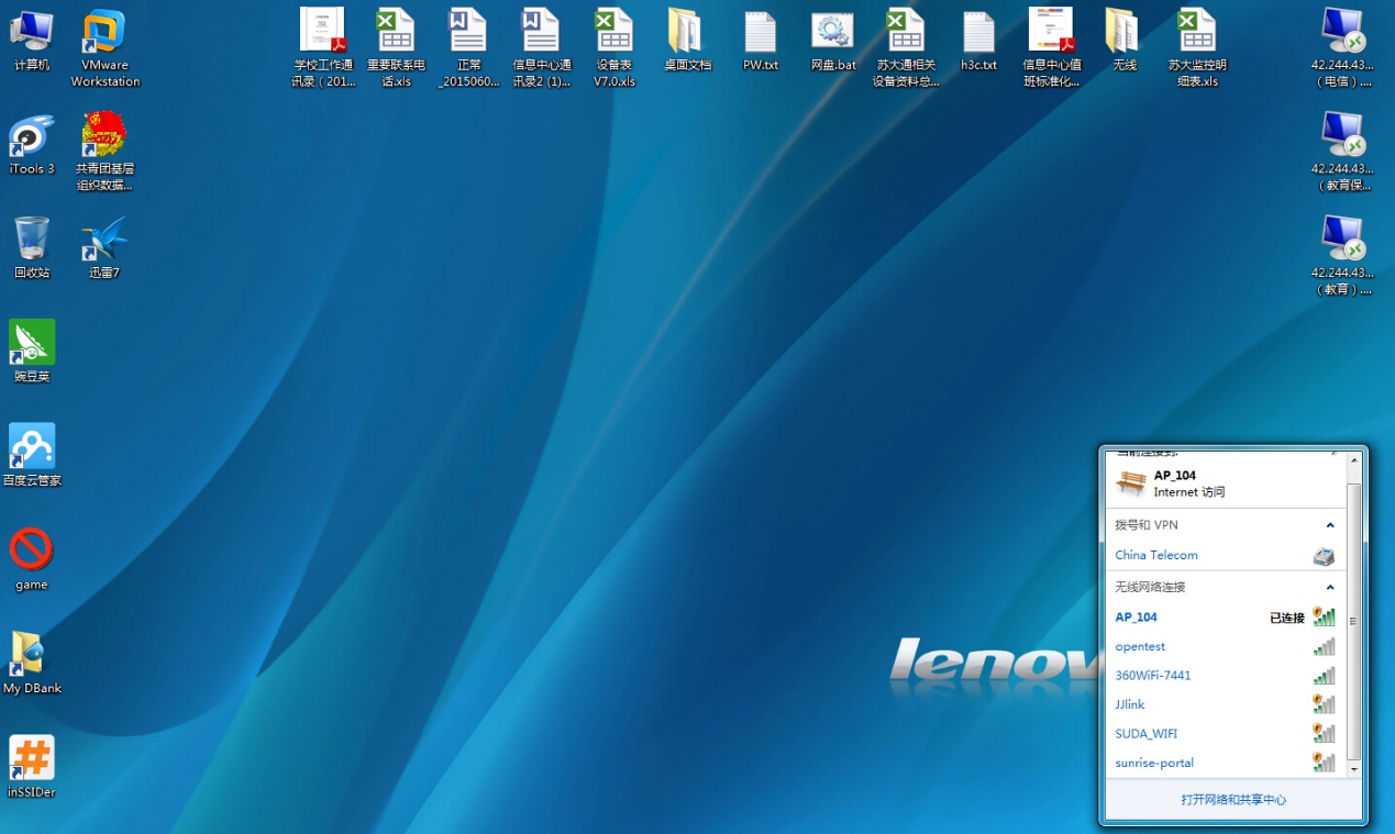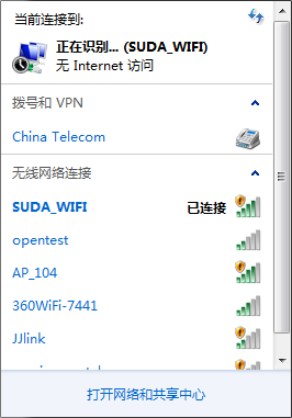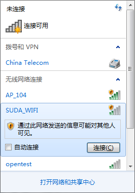 Win7操作系统在无线方面有大幅的增强。无线网卡正常的情况下,系统的右下角会出现一个类似信号强度的无线网络图标。右键单击该图标,会显示出本机无线网卡扫描到的当前的区域的可用无线接入点,如下图。其中有苏州大学信息化建设与管理中心的接入点,也可能有其他的接入点。目前,苏州大学信息化建设与管理中心的接入点为“SUDA_WIFI”,需要通过web方式认证才可以连接上校园无线网络,认证的用户名和口令为计费网关的账号和口令。