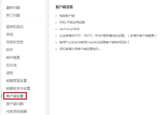 在帮助页面右侧导航栏,点击红框处“客户端设置”,如下图: