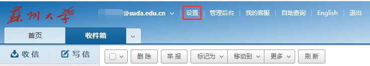 点击下图红框处的“设置”按钮,在下拉菜单中选择“邮箱设置”。