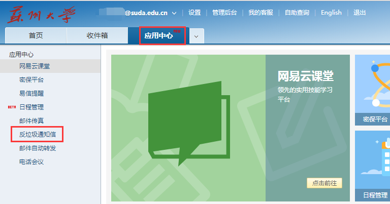 2. 打开“应用中心”,选择“反垃圾通知信”,如下图: