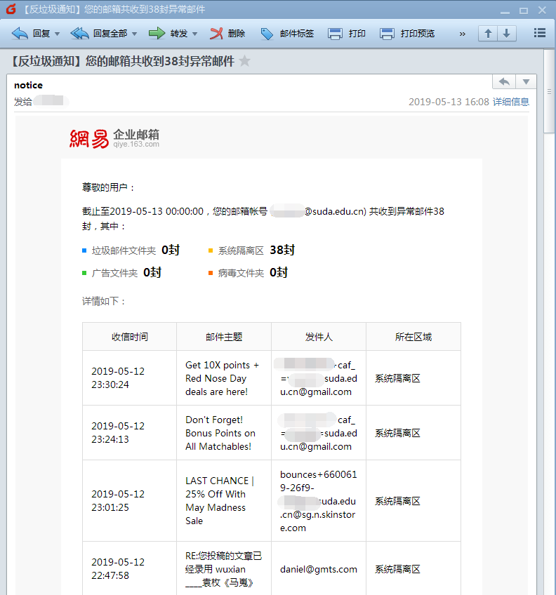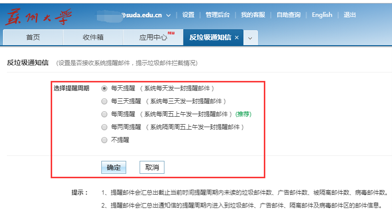 4. 系统会根据您选择的周期,将反垃圾通知信发到您的收件箱里。